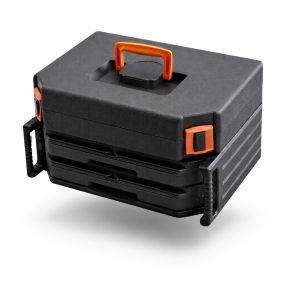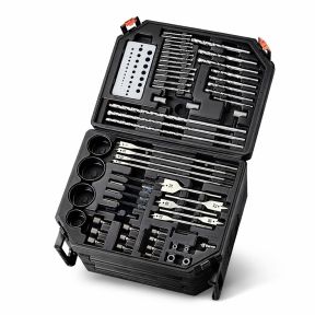 Contains wide variety of drill and screwdriver bits, drivers and saws.