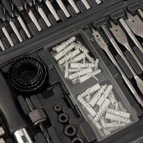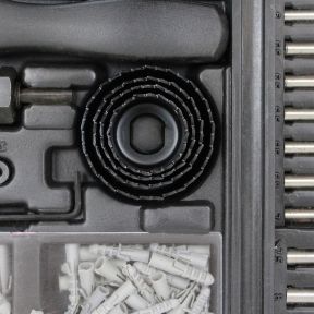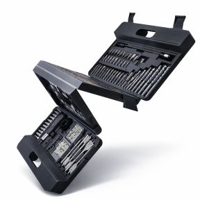 Contains wide variety of drill and screwdriver bits, drivers and saws.